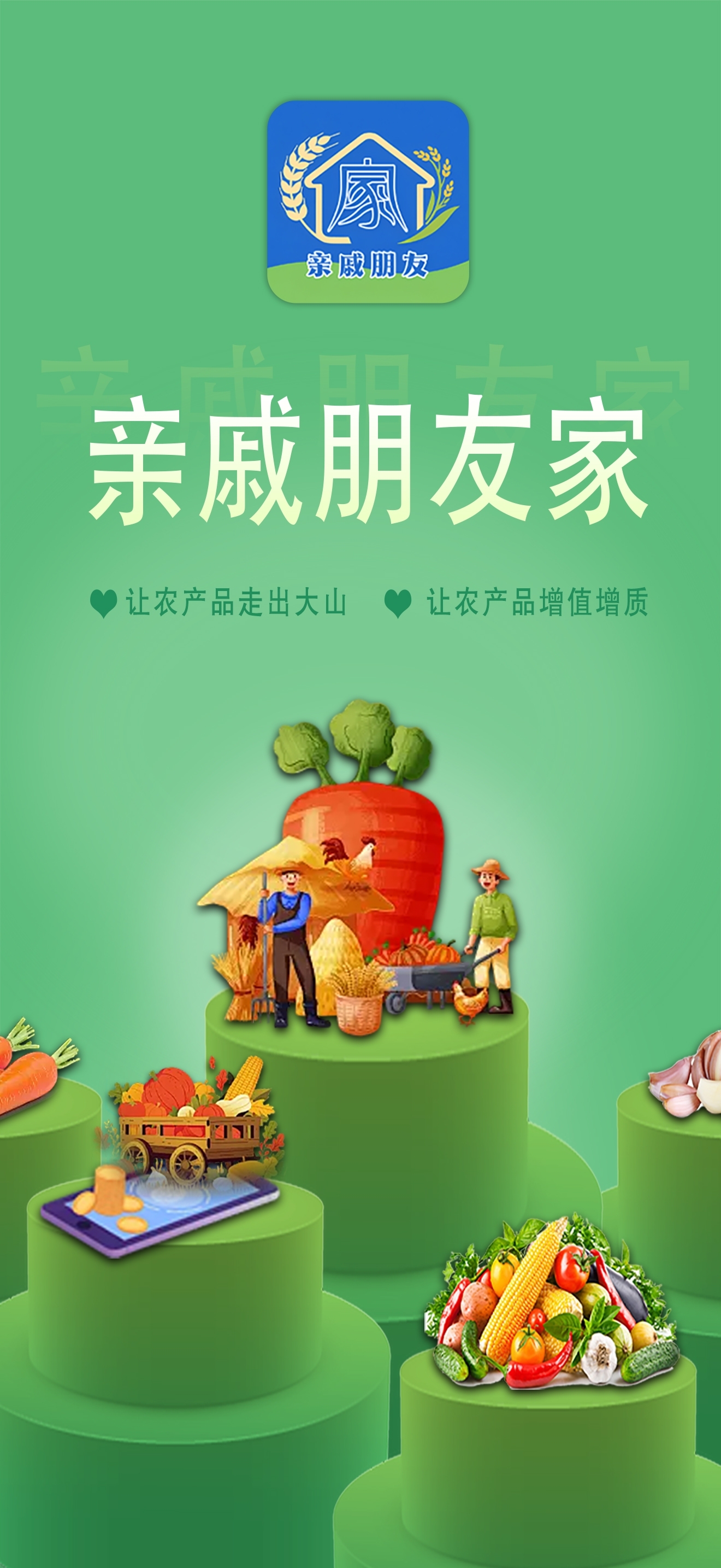 华夏文明传承至今,耗费了无数先辈心血,经历了多少朝代更迭。历朝历代国泰民安,在国泰时又以民安为先,民安则国泰。纵观数千年历史,只有农业兴才能保人民安居乐业。时至今日我华夏农业虽然依旧兴盛,但真正的农民朋友却依旧是苦苦支撑。我国电商平台繁多,但没有一个真正是为全国农民朋友解决“谷贱伤农”之难题而去的,更多的利润让中间商和各个平台拿了去。年轻一代大部分更是直接转化为“农民工”不再懂农时、农事。而今时值国内经济发展之大变局,很多农民工已无工可务,大量农民工面临失业,农业的传承又在一定程度上必须延续。亲戚朋友家是一家致力于服务农业发展,在党的领导下全心全意“为人民服务”的创新平台。旨在全力打通农户田间地头到餐桌的信息壁垒,让我们的食客能吃上真真正正“土生土长”的安全蔬菜、水果以及山野长大的肉类食材,让我们的农户能真真正正在田间地头就能有一定的收入,助力乡村振兴。让我们的人民在农村老家就可以安居乐业,为我们华夏文明的“传承文明、开拓创新”,在党的领导下团结各族人民培育出更肥沃的土壤